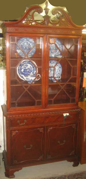American mahogany china cabinet with Colonial windows and broken pediment on top