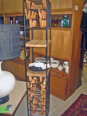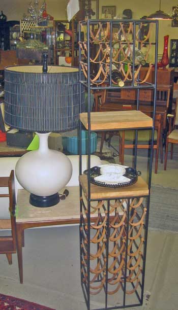 Mid century Paul McCobb or Aurthur Umanoff wine rack with leather straps in black iron frame. Holds 30 bottles with 2 butcher blocks. All straps are intact. Circa late 1960's. Measurements: 14" wide x 11" deep x 66 1/2" tall INVENTORY # 2333 PRICE: $ 2350