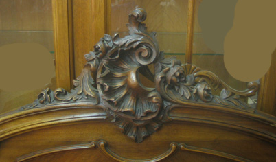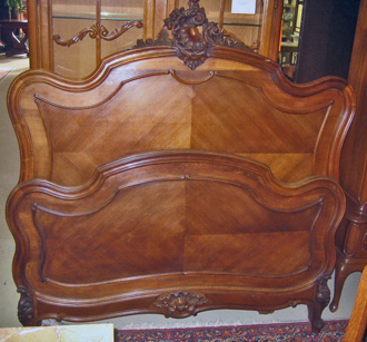 French walnut bed with hand carved crest with shell and roses motif. The headboard and footboard have lots of curves with bookend veneers, as shown in the large photo.